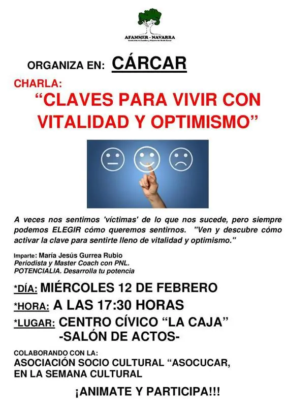 Acompáñanos en esta interesante charla impartida por María Jesús Gurrea Rubio, periodista y Master Coach en PNL. Descubre cómo elegir tu actitud frente a la vida y activar la clave para sentirte lleno de vitalidad y optimismo. ¡Una oportunidad para reflexionar y potenciar tu bienestar!